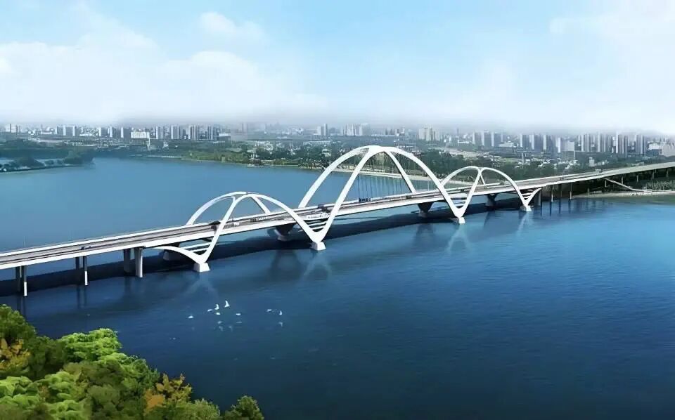 主桥桥型为五跨飞燕式中承钢箱梁提篮拱桥,多拱尺寸摹拟“湘江碧水”的行为样式,竖直梁面则寄意河堤静态变量河面上,动一动一静连在一起系的简练立体尺寸诠释着建设项目智能化。