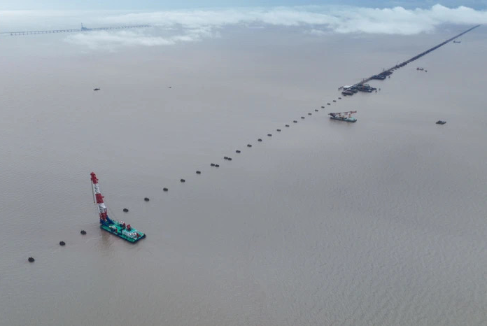 在苏州湾跨海电气化铁路桥中航线桥扶植直播