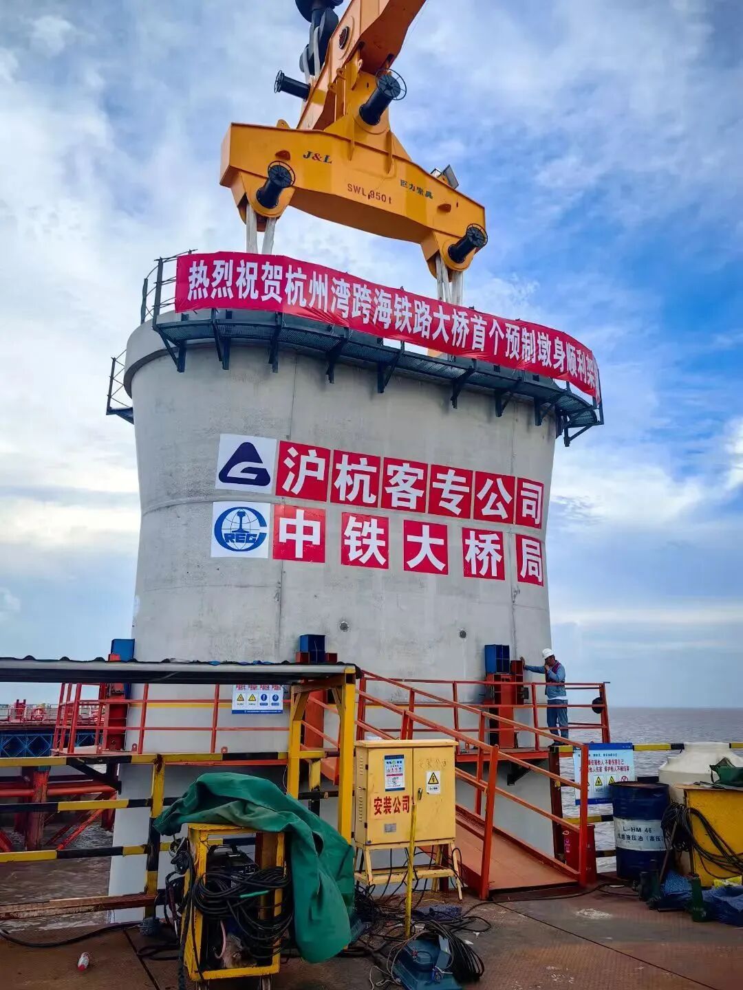天下初次!巨力索具助力杭州湾跨海铁路桥首坐预制墩身胜利架设
