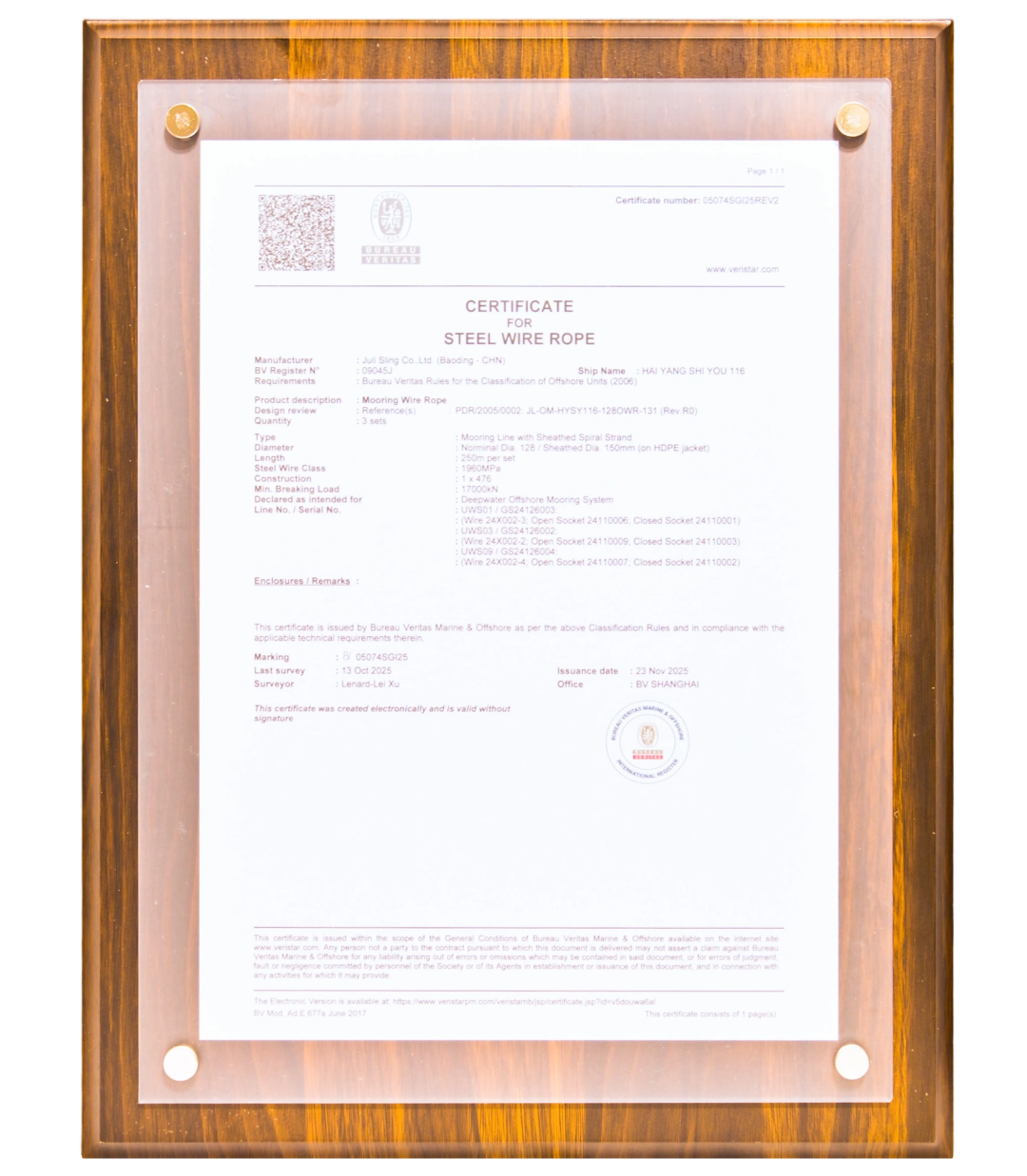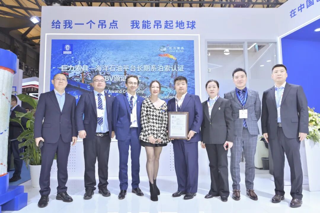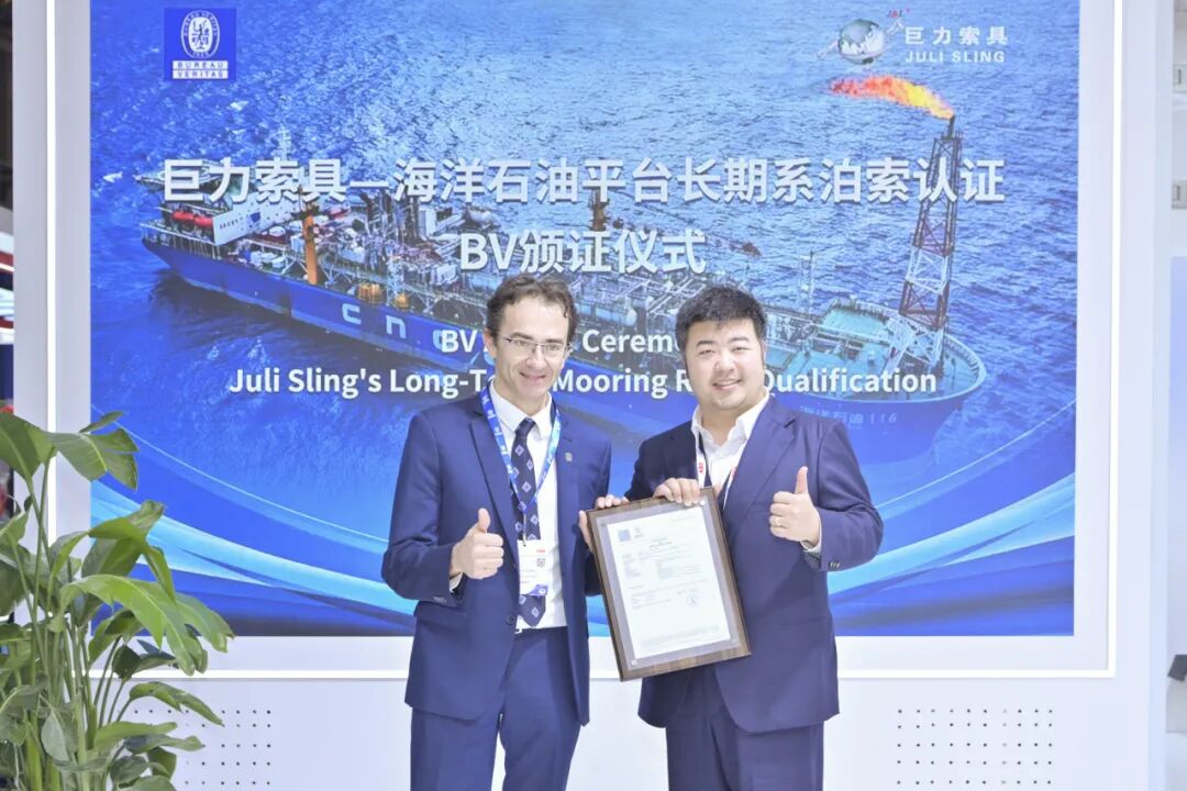 12月2日,2025中国国际海事会展(MARINTEC CHINA 2025)昌大揭幕。展开首日,环球抢先的查验认证机构法国船级社(Bureau Veritas,简称BV)为巨力索具进行“陆地煤油平台持久系泊索”专项认证证书颁证典礼,巨力索具总裁杨超亲临现场,代表公司接管了这份象征国际高规范承认的主要证书。