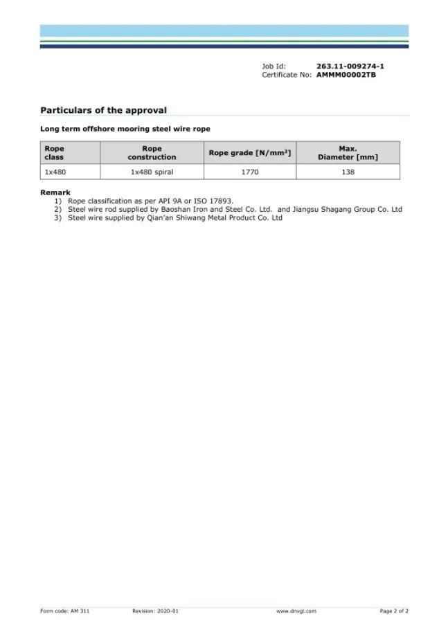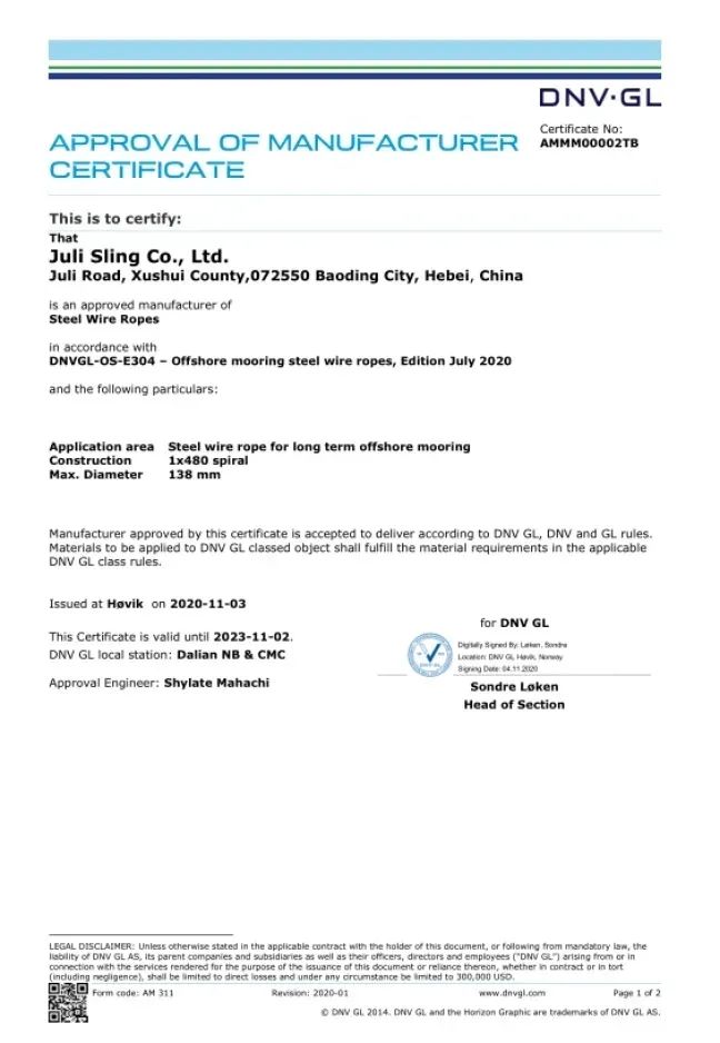 2020年11月,巨力索具获得了永远系泊用单股涂塑钢丝绳的DNV·GL工场承认证书,成为国际首家经由进程该类钢丝绳DNV·GL工场承认的厂家。