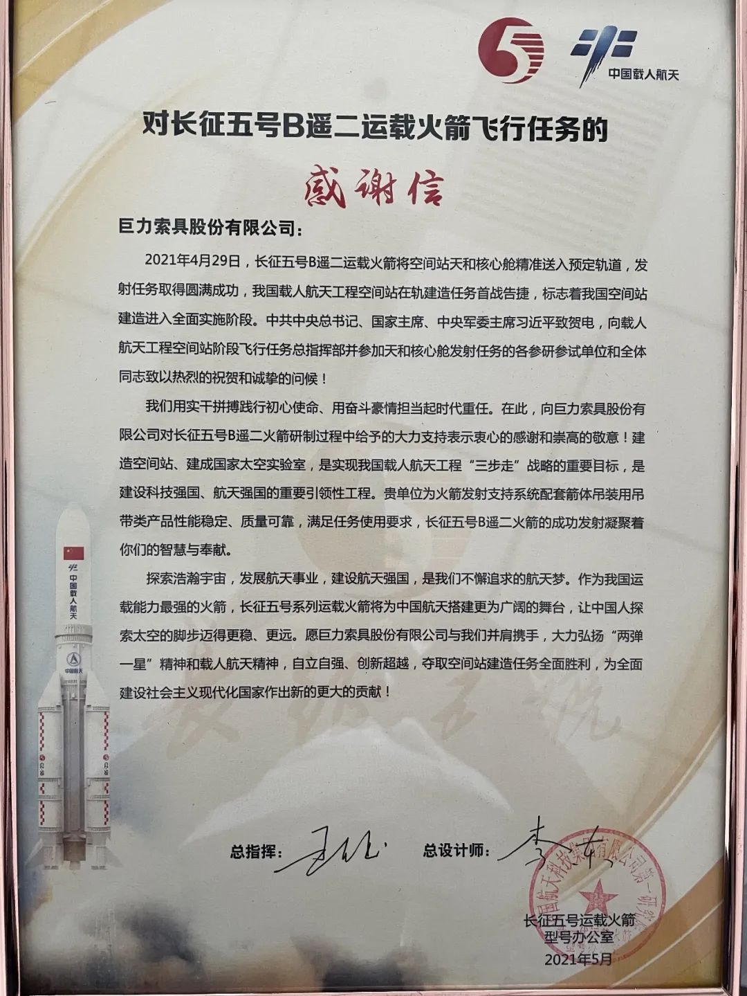 日前,巨力索具股分无限公司收到中国航天科技团体第一研讨院发来的感激信,向巨力索具对长征五号B遥二运载火箭飞翔使命和研制进程中赐与的鼎力撑持表现衷心的感激。