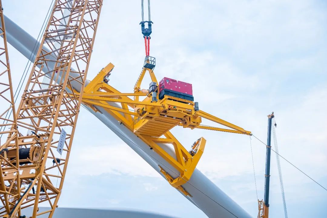 大兆瓦全角度海上单叶片吊具可知足单只叶片最大承重50吨。同时,将原本的吊装窗口平均风速晋升至15m/s,最大阵风风速可达18m/s,极大拓宽了风机吊装窗口期,冲破了海上吊装功课风速边境限定,是又一款海上风电单叶片吊装“利器”。