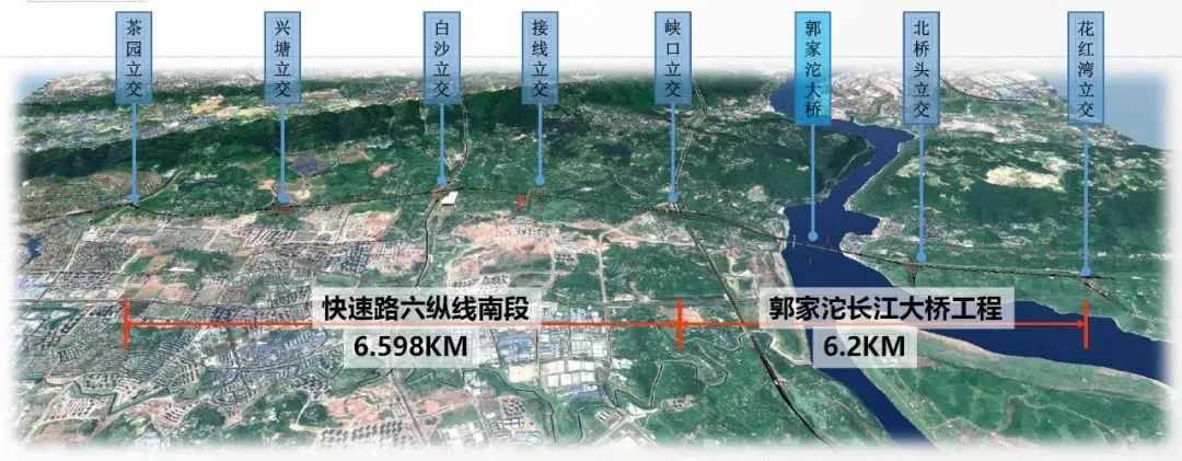 郭家沱长江大桥名目是重庆市级重点工程,也是重庆疾速路“六纵线”跨长江节点工程。该名目线路北起江北郭家沱,南接南岸峡口镇,全长6.2千米,由花红湾立交、郭家沱长江大桥、峡口立交三部分组成。