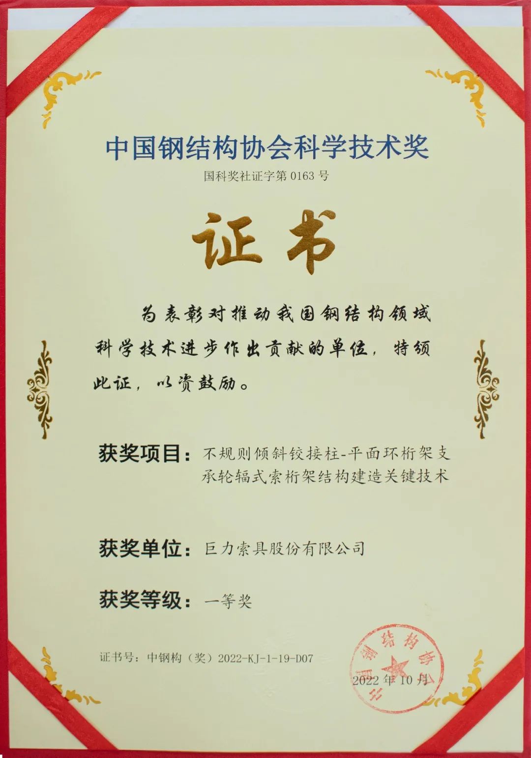 克日,中国钢布局大会暨粤港澳大湾区钢布局成长峰会在广州召开,会上停止了颁奖典礼。由巨力索具到场三亚国际体育中间名目实现的“不法则倾斜铰接柱-立体环桁架支承轮辐式索桁架布局制作关头手艺”名目取得一等奖。进一步揭示了我司在钢布局范畴成长的立异气力。