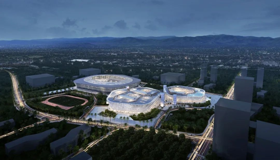 该运动场全体外表面立体投影为不法则的倒角五边形,其外表面南北最大长度约305米,工具约270米,罩棚最高点标高约46米。从运动场内的观众席处瞻仰,一根根钢索穿插毗连,各自使劲拉伸,庞大钢网架跃然显现,恰似一座兼具了力学、美学、科技的艺术品。