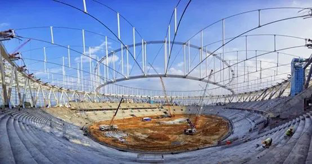 运动场钢布局屋盖接纳轮辐式索桁架布局,外侧为支持于内压环、外压环柱顶的程度安排的立体环桁架布局,由轮辐式拉索、竖杆、PTFE膜及环桁架构成。表里环轴外形为卵形,悬挑长度45米,索周边支承于核心钢布局内环梁上。核心钢布局最大跨度约39米。