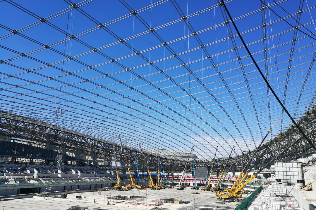 卢塞尔运动场是2022卡塔尔天下杯主运动场,最多可包容92000人。该运动场形状以阿拉伯椰枣碗和搪瓷灯笼为设想灵感,屋顶为双曲面机关,外型呈马鞍形,工具高,南北低,全部运动场投影为圆形。屋面主索网接纳鱼腹式索网布局,跨度到达274米,最大悬挑间隔为76米,该布局情势为初次利用,不管是对产物的制作,仍是施工装置都具备极大的挑衅。是以卢赛尔运动场同样成为了环球最大跨度双层穿插索网屋面单体布局。同时也是设想规范最高的索网屋面单体修建。全部索网布局从产物原材推测制品制作和施工装置均跨越了西欧规范请求,巨力索具凭仗过硬的气力成为一级专业分包,担任履行全部屋顶索膜布局系统的设想、供货、装置总承包任务。
