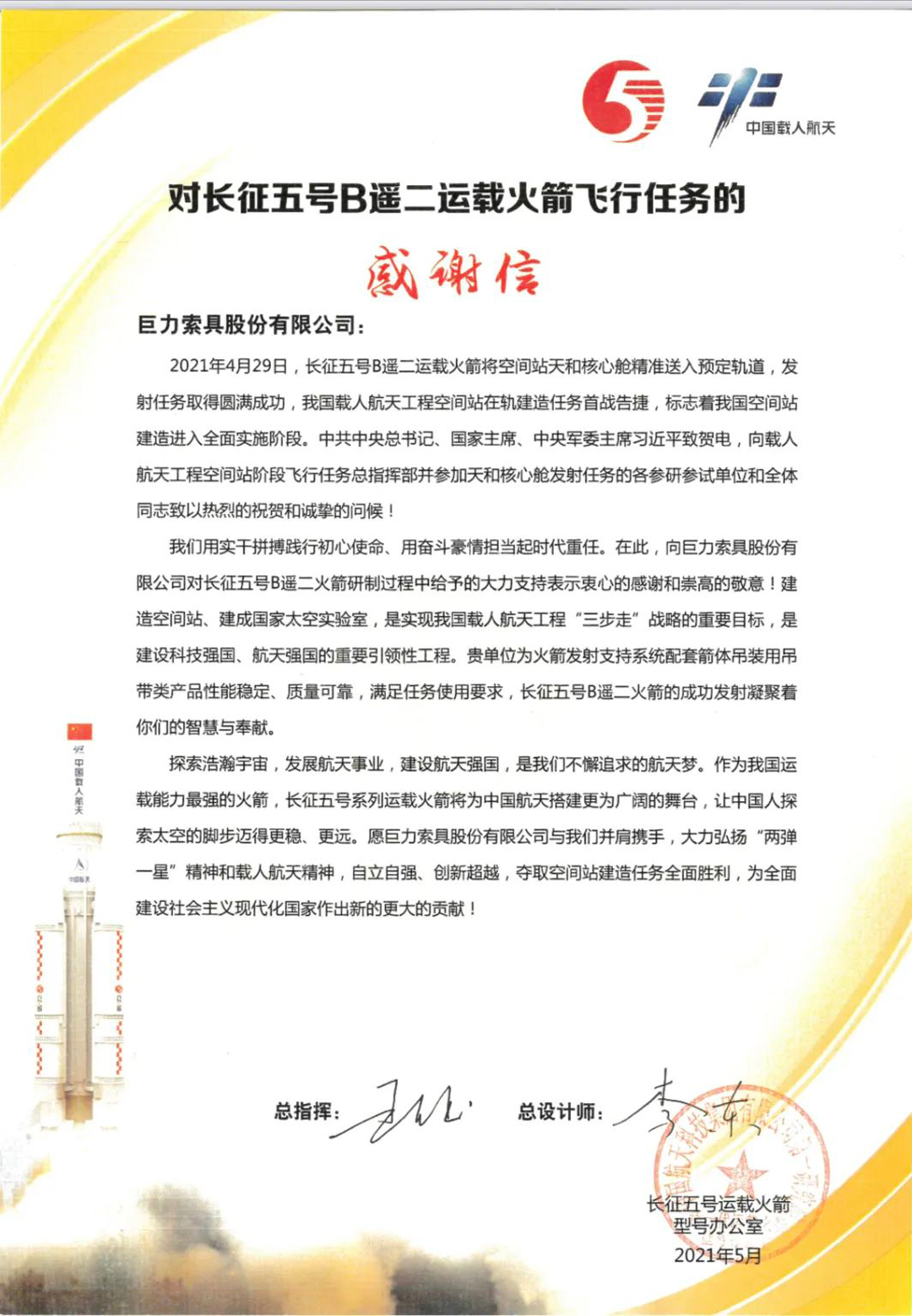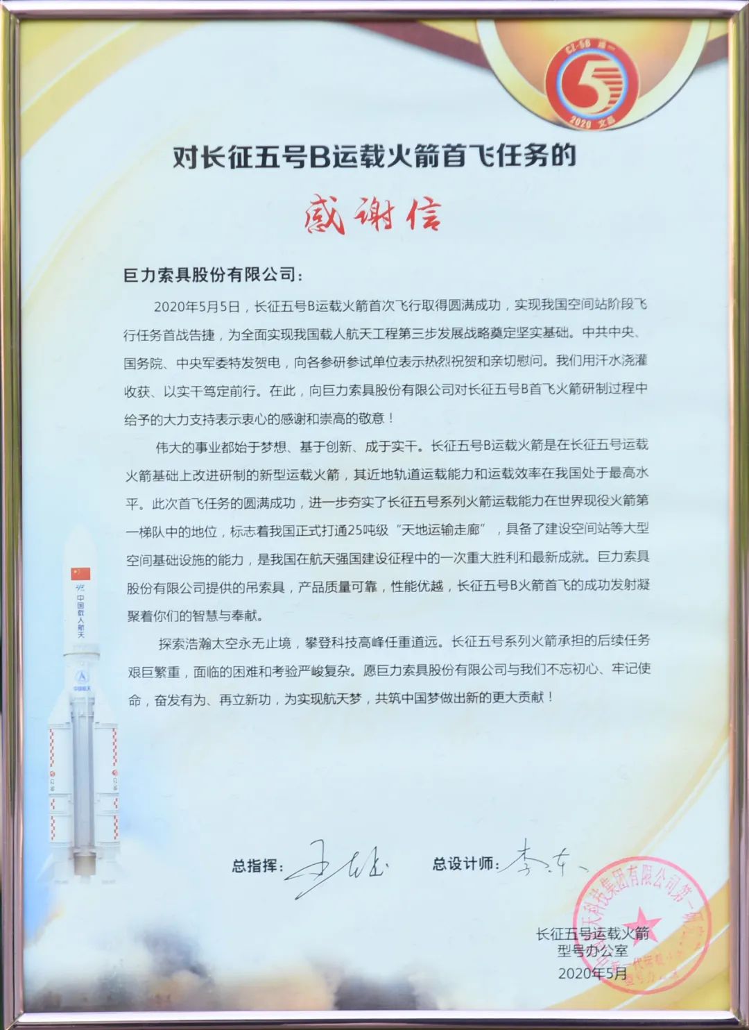 巨力索具作为航天奇迹协作火伴,自到场以来,一向期望依靠本身专业才能在航天范畴阐扬上风,助力航天奇迹兴旺成长。