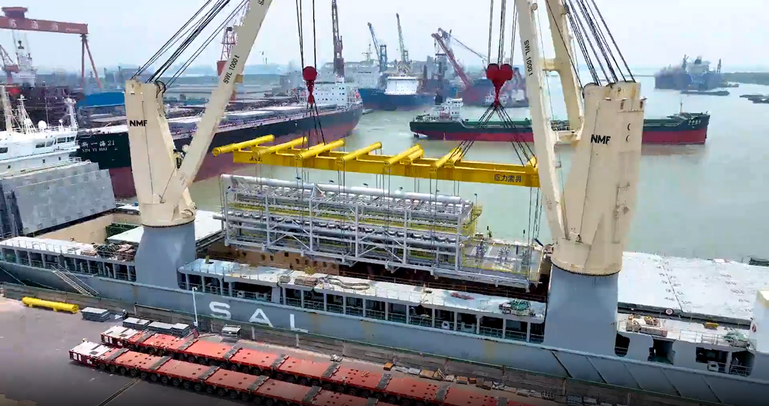 巨力索具首要担任该名目模块的吊装,别离供给了额外载荷为600T、300T、690T的吊框,吊装才能为55T、75T、100T的卸扣及6种差别规格的无讨论绳圈,并供给专业吊装打算,全程保证模块吊装的顺遂停止。